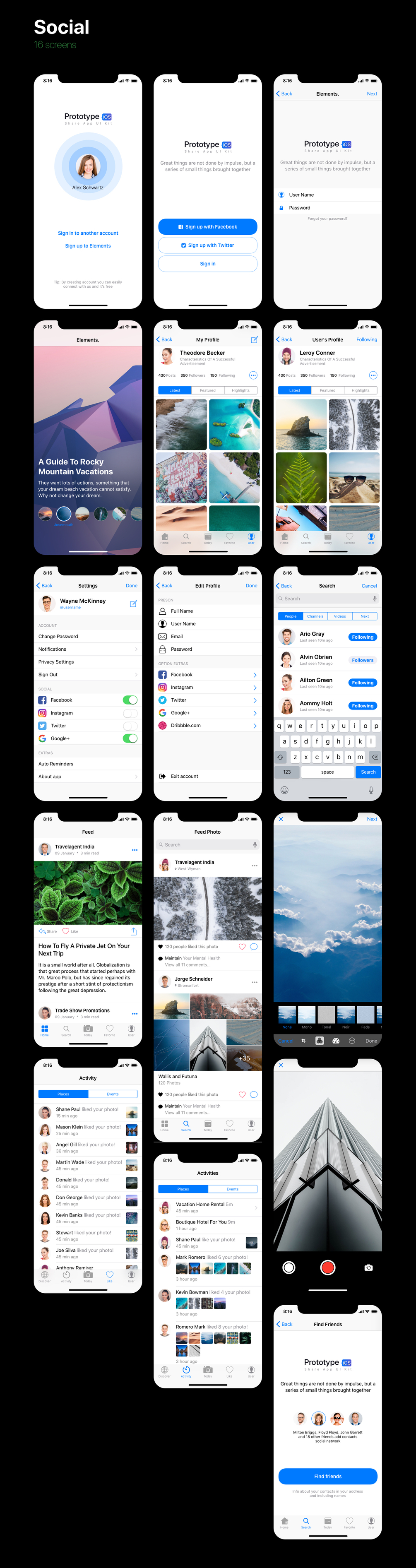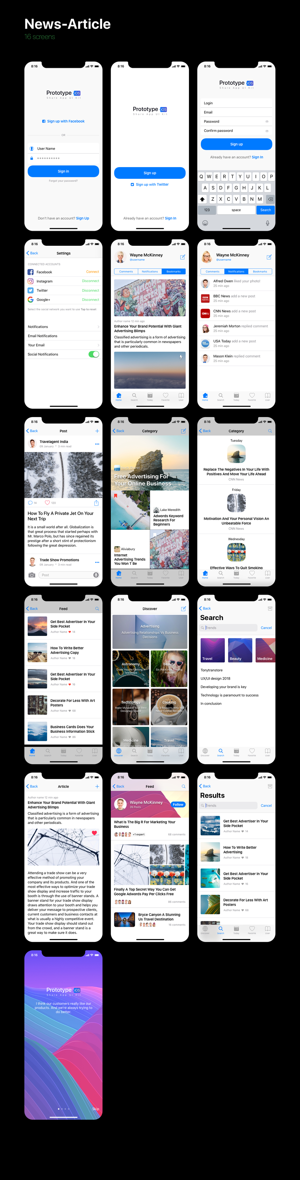 Prototype iOS Share App UI Kit use multi-purpose is a collection of 100+ screens made with care for iOS guidelines and divided into 7 popular content categories and carefully assembled for Sketch and Adobe XD CC. Make your app design work faster!